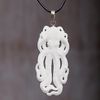 I purchased this piece because I'm very fond of the dragon motif, and this carved dragon didn't disappoint. The carving is lovely. However, it came on a thin double brown leather cord (unlike the photo online) that is very short without an obvious way to open it, and it's impossible to get it over my head. I'll have to cut it and put it on a different cord or chain. This is why I didn't give the piece 5 stars.