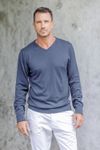 This is a very nice sweater because it is lightweight and so comfortable to wear. The blue color is rich. I now have all four colors that were offered and I know I will get a lot of wear from them all as they are so well made.